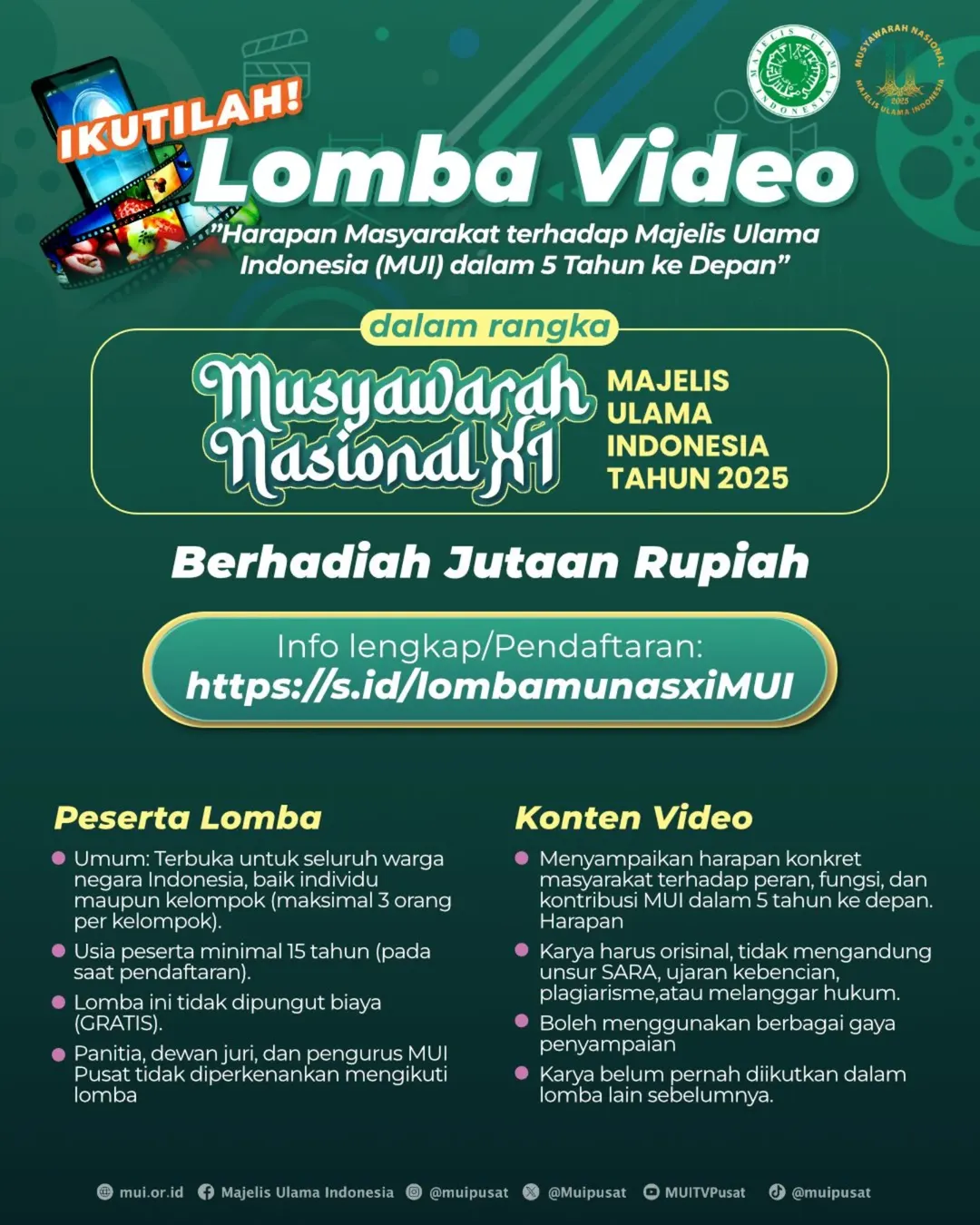 Di dalam rangkaian Munas MUI XI juga diselenggarakan lomba Video. Informasi lengkap nya ada di flayer berikut ini :